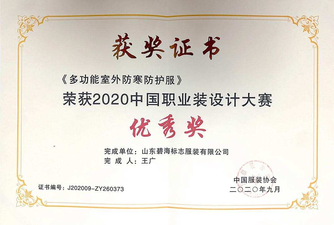 近日,以“文化赋能·产业联动”为主题的“2020中国职业装产业大会暨中国职业装产业创新发展论坛”在河南长垣市召开。 活动期间,举行了“2020中国职业装设计大赛”颁奖典礼。其中,山东碧海标志服装有限公司设计作品——“多功能室外防寒服”入围决赛,斩获大赛优秀奖。